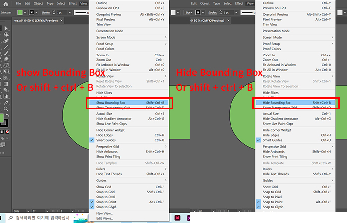 - 반대로 바운딩 박스를 안 보이게 싶다면 View -> Hide Bounding Box 또는 shift + ctrl + B( 바운딩박스를 활성화할 때와 똑같은 단축키 )로 비활성화한다.( but 바운딩 박스를 비활성화시킬 일은 거의 없음 )